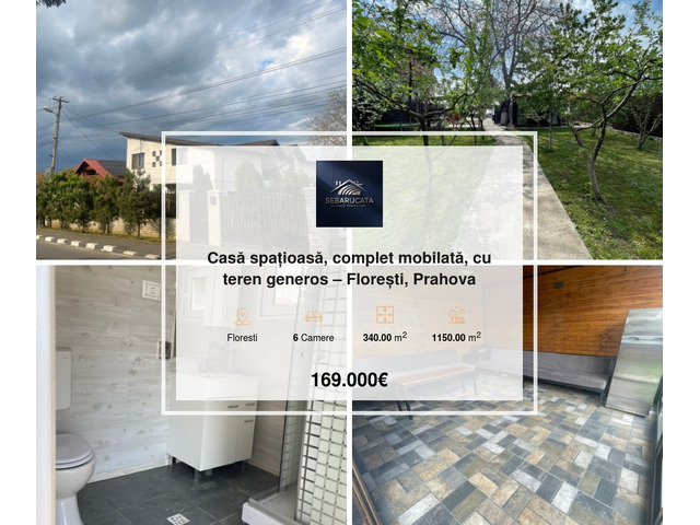 Cătălina Anghel -broker imobiliar vă prezinta spre vânzare o proprietate deosebită, situată într-o zonă liniștită din Florești, Prahova, amplasată stradal și beneficiind de o deschidere de 17,5 metri liniari. Imobilul se află pe un teren generos de 1.150 mp, oferind un cadru ideal pentru relaxare și confort. Finalizată in 2013 cu un regim de înălțime P+1E, casa dispune de camere luminoase și spațioase, perfect compartimentate pentru o familie. Proprietatea se vinde complet mobilată și utilată, gata pentru a fi locuită fără investiții suplimentare. Curtea este amenajată cu loc de parcare, terasă, zonă de grătar și o livadă pe rod( caiși, meri, cireși, vișini, zarzăr, nuc, etc), ideală pentru momente de relaxare în aer liber. Imobilul este racordat la toate utilitățile necesare: apă, canalizare, gaze și electricitate. Toate detaliile prezentate fac din această casă alegerea perfectă pentru cei care își doresc un cămin primitor, într-o zonă aerisită, cu acces facil și toate facilitățile la îndemână. Sunteti interesati sa vedeti locația cu toate facilitățile ei? Contactează-ne și împreună stabilim toate detaliile unei vizionari!