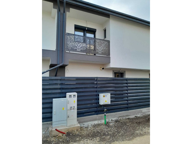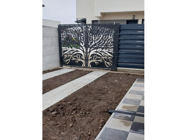 Curte amenajata cu pavaj, poarta auto, poarta pietonală și panourile decorative de la balcoane sunt model deosebit decupat cu laser, copacul vieții.
