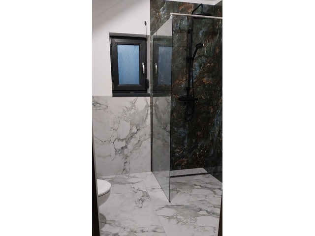 Finisaje deosebite, scări placate cu granit fiamat platinum gray, glafuri exterioare granit lucios platinum grey, gresie și faianță de calitate placi mari 120×60 . Băile și balcoanele cu hidroizolație sika.